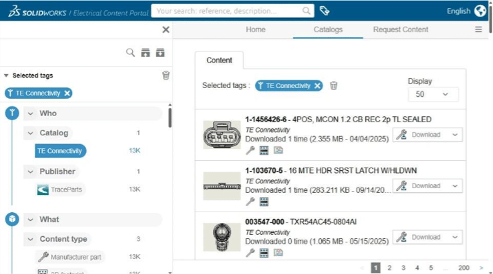 Der TE-Connectivity-Katalog ist seit der Version 2026xSP01 FD01 (Veröffentlichung Februar 2026) im Electrical Content Portal verfügbar.