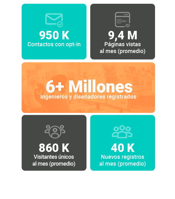 - Marketing dirigido por correo: Seleccione su público objetivo de entre más de 950 000 ingenieros y diseñadores adheridos. Genere contactos, aumente el tráfico en su web y promocione sus productos.
