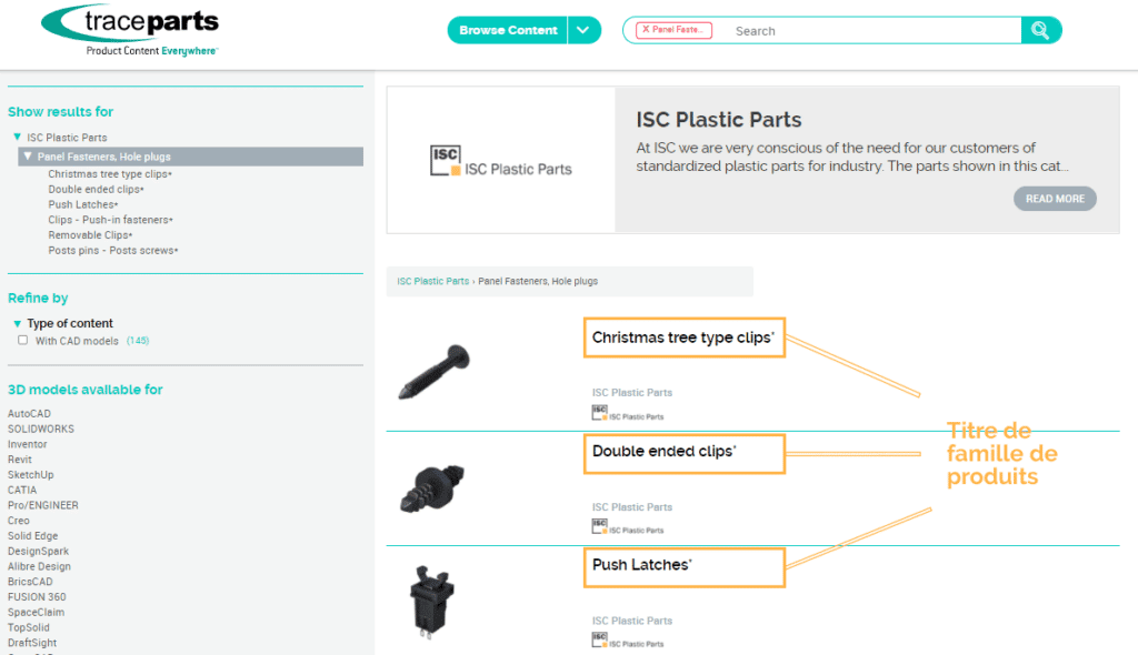 • La description courte apparaît dans la page de recherche et la page du produit. Ce texte est utilisé pour compléter les titres et la description courte des produits. Ce texte est indexable par le moteur de recherche de TraceParts.com.