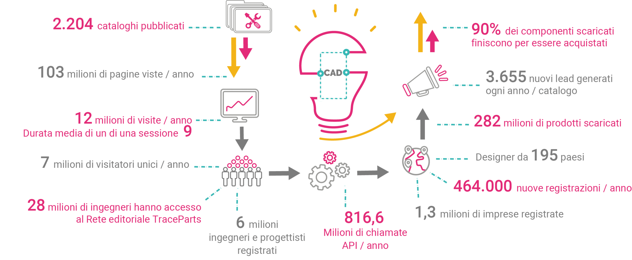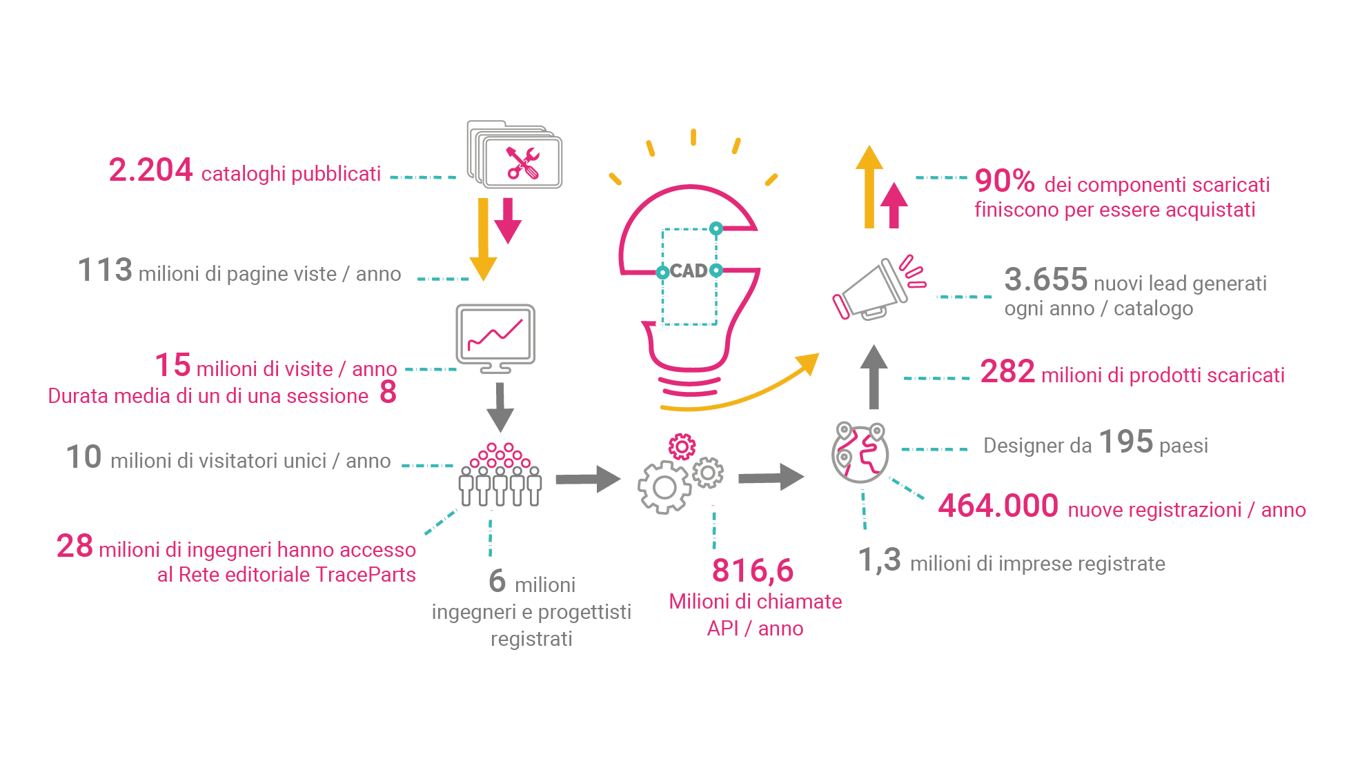 Questi professionisti utilizzano TraceParts 24 ore su 24, 7 giorni su 7, per scaricare gratuitamente centinaia di milioni di componenti da inserire direttamente nei loro progetti. Quando viene scaricato un prodotto, i fornitori ricevono informazioni dettagliate sull’utente che ha effettuato il download. In questo modo, i team addetti alle vendite e il CRM possono disporre di contatti altamente qualifica