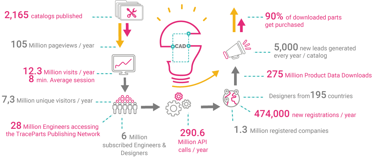 Engineers and Designers use TraceParts 24/7 to download for free hundreds of millions of components to include and specify them directly into their design projects. When a product is downloaded, part vendors receive detailed information about who has made this download, fueling their sales teams and their CRM with highly qualified sales-ready leads.