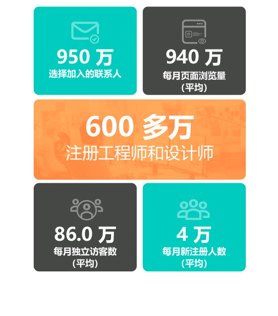 - 定向电子邮件营销: 从 950,000 多名选择加入的工程师和设计师中选择您的目标受众。开发潜在客户、增加网站流量并推广您的产品。