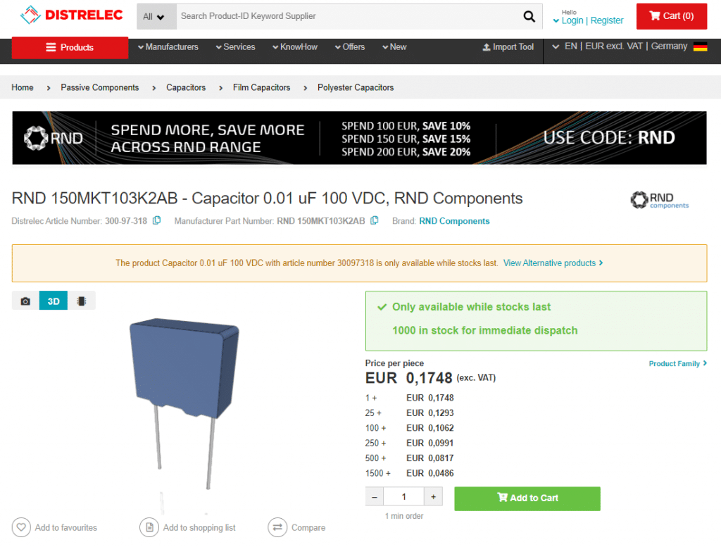 Distrelec 还将这种增强的产品内容融合到其电子商务平台,使客户能更方便快捷地选择产品。3D 模型的范围涵盖 24, 000 多种产品,并且种类将会持续增长,其中包括 Distrelec 自有品牌 RND 的产品。